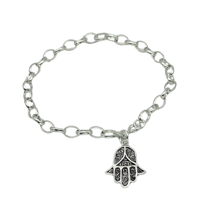 • 925 Sterling Silver Oval Link Bracelet with Hamsa Charm (925BRAC024)