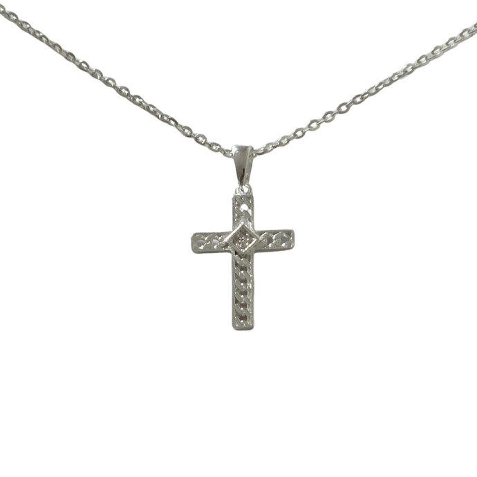 • 925 Sterling Silver Cross Pendant Necklace - Textured Finish with Cubic Zirconia Accent | 50 cm Chain & Ring Clasp (925SETPC002)