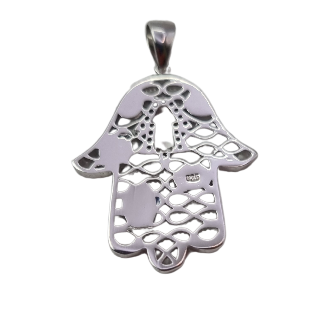A Hamsa or Hand of Fatima pendant in 925 silver, often adorned with an Evil Eye, is a deeply symbolic piece of jewelry. The Hamsa is a universal symbol of protection, good fortune, and blessings, while the Evil Eye is believed to ward off negative energies. Together, they create a powerful talisman that blends cultural significance with elegant design.