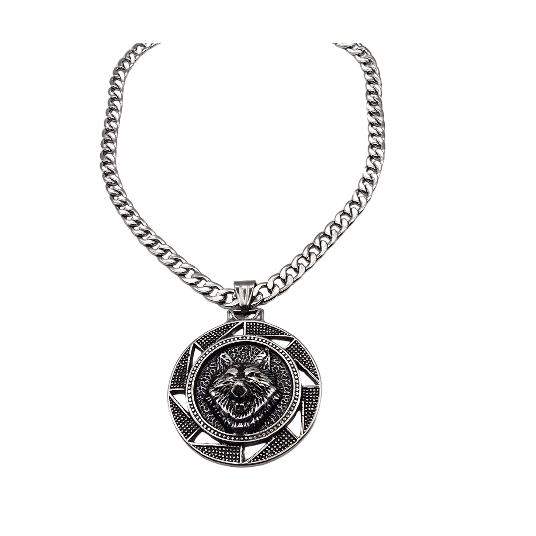 - Pendant: 3D wolf head, 3.9 cm diameter, detailed relief and textured finish for depth and realism.