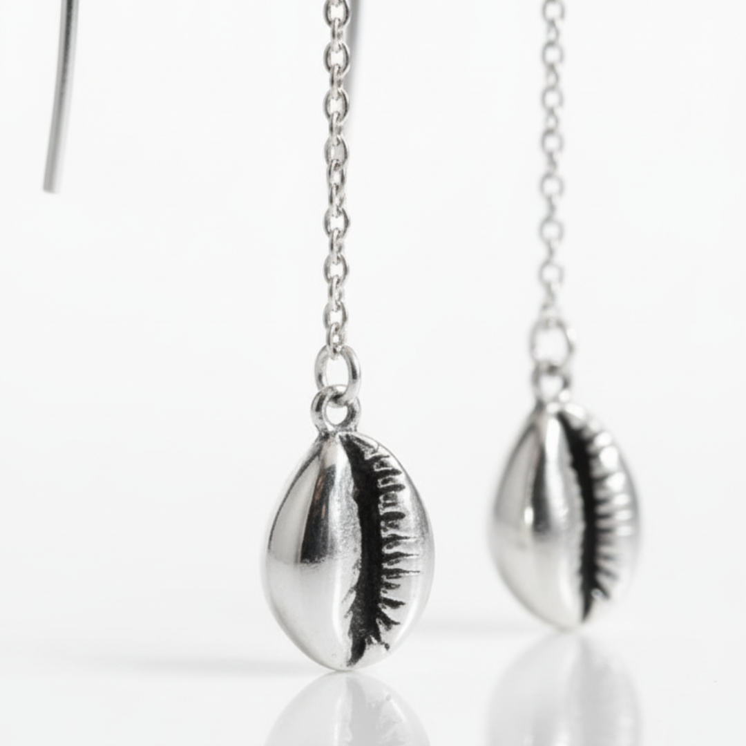 At the end of each chain hangs a beautifully detailed cowrie shell charm, measuring 11mm x 7.6mm-a subtle yet striking symbol of femininity, protection, and abundance. The shell's polished surface reflects light with a soft shimmer, while its organic contours add texture and depth to the overall silhouette.