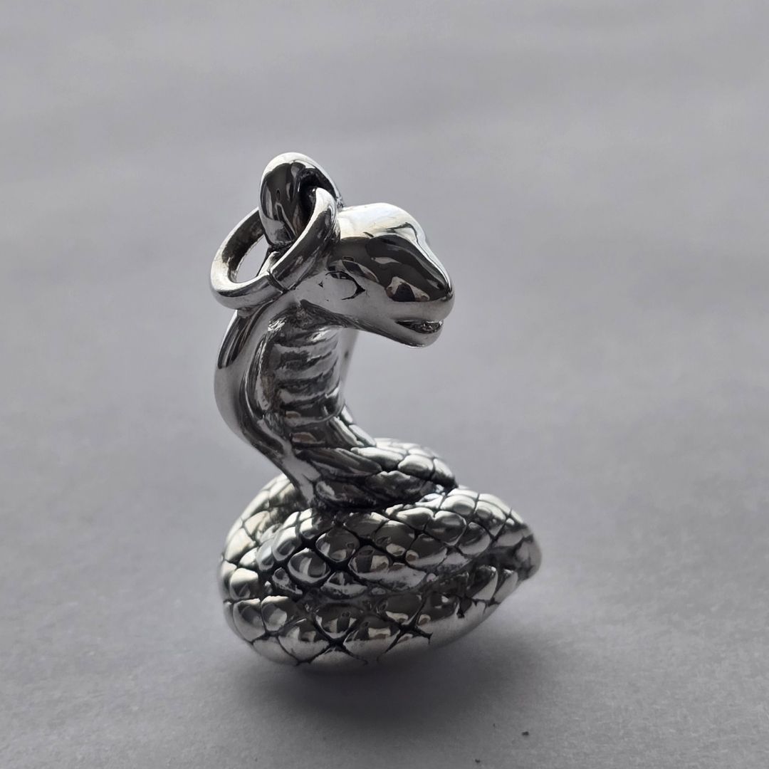 Command attention with this bold Cobra Spirit Pendant, a powerful emblem of transformation, protection, and inner strength. Expertly handcrafted in 925 sterling silver, the cobra is depicted in its iconic defensive stance - hood flared, head raised - ready to strike. The finely textured scales catch the light with every movement, while the polished finish adds a sleek, modern edge to this ancient symbol.