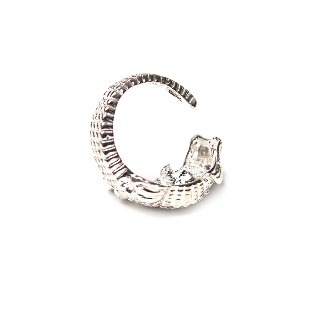 The sterling silver ring is designed in the shape of a crocodile, making it a bold and unique statement piece. The craftsmanship is intricate, with detailed carvings of the crocodile's scales, limbs, and facial features. The crocodile's body wraps around to form the band of the ring, creating a striking and artistic representation. Sterling silver is a popular material for high-quality jewellery, adding to the ring's appeals.