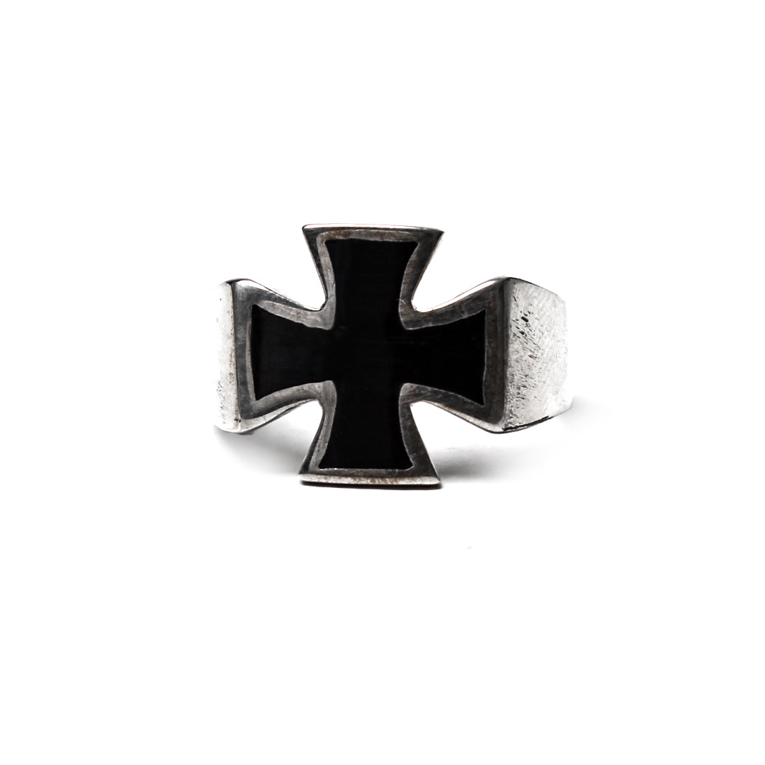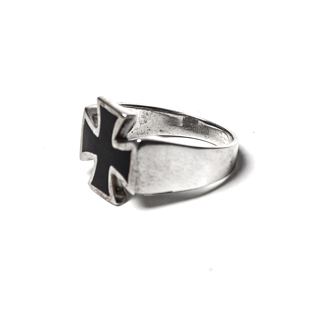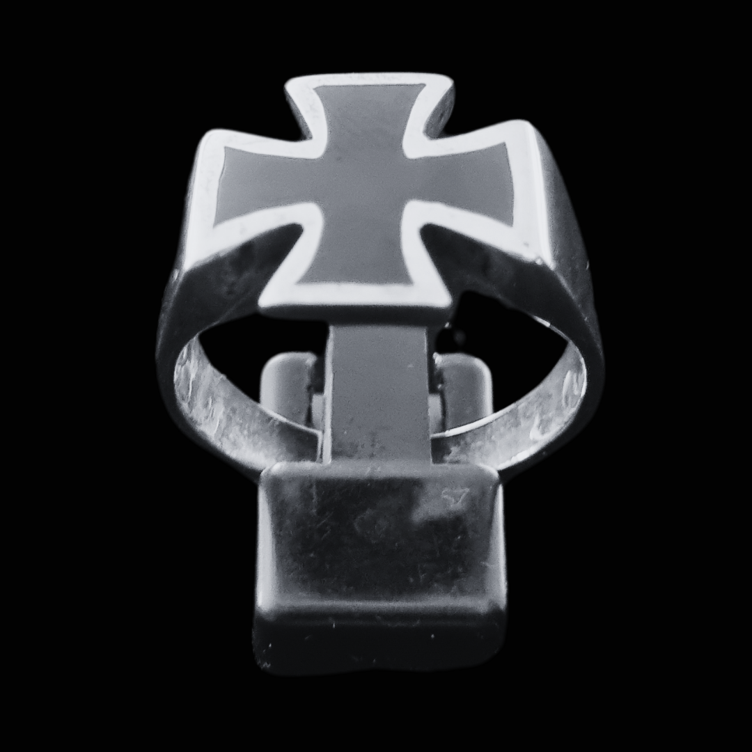 The image shows a sterling silver ring featuring a Maltese or Crusaders cross design. This type of ring is often associated with biker culture and symbolizes attributes such as power and strength. The ring has a polished silver band with a prominent black cross on the front. The cross has a distinctive shape with four equal arms that widen at the ends, characteristic of the Maltese cross. This piece of jewelry is interesting and relevant due to its cultural significance and the craftsmanship involved in its design.