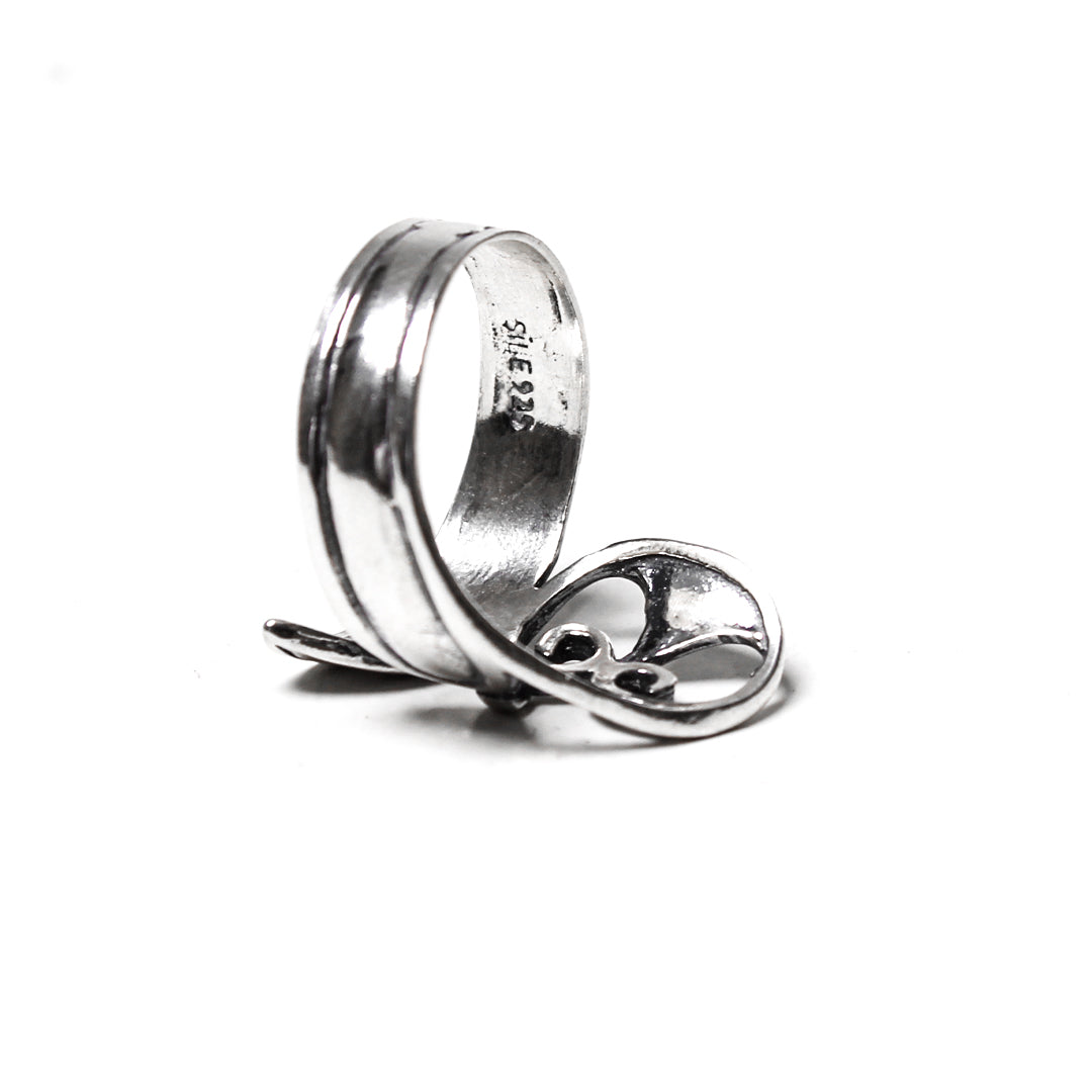 An elegant women's ring with a delicate and intricate design. The ring is made of silver and features a unique openwork pattern with swirling and curved lines, giving it a sophisticated and artistic look. The craftsmanship is detailed, highlighting the fine work involved in creating such a piece of jewelry. This ring is interesting and relevant due to its elegant design and the skillful, delicate work that went into its creation.