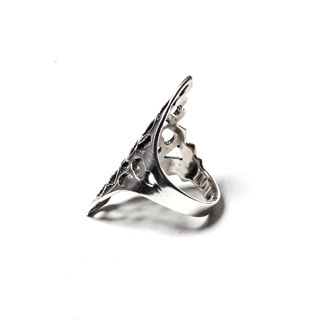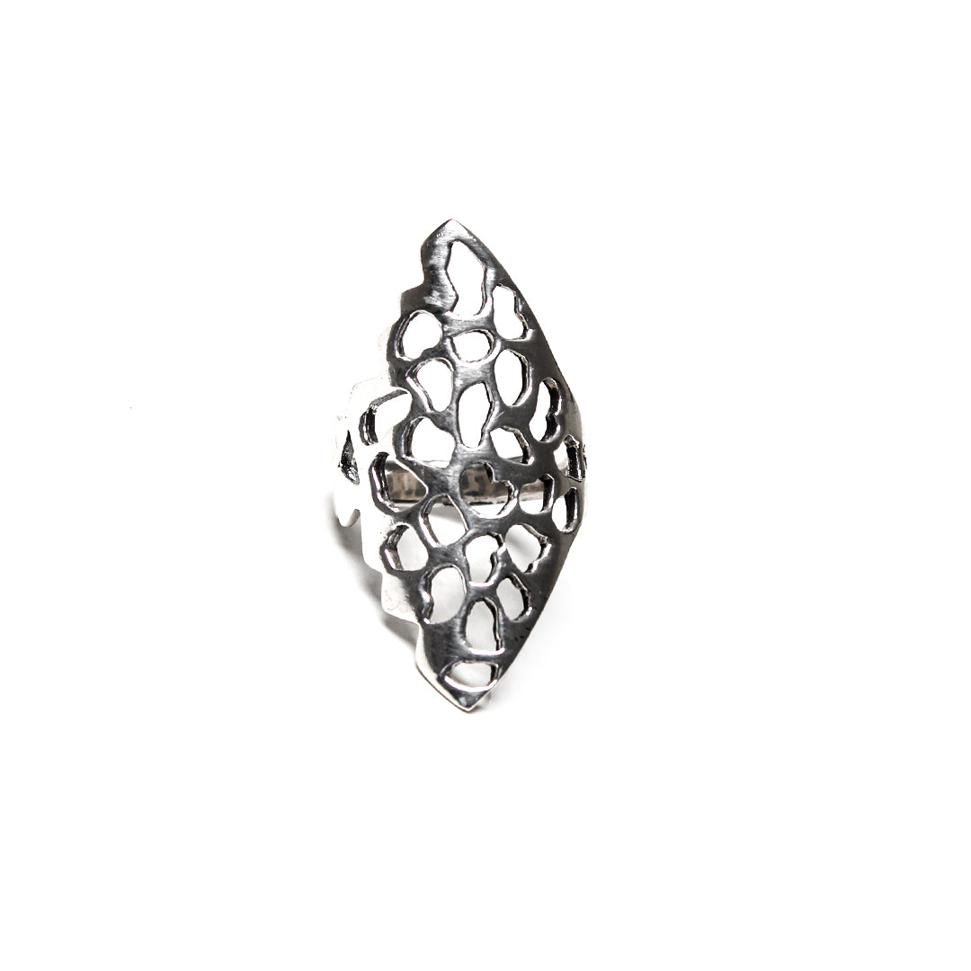 An elegant women's ring with a delicate and intricate open design. The ring is made of silver and features a unique openwork pattern with swirling and curved lines, giving it a sophisticated and artistic look. The craftsmanship is detailed, highlighting the fine work involved in creating such a piece of jewelry. This ring is interesting and relevant due to its elegant design and the skillful, delicate work that went into its creation.