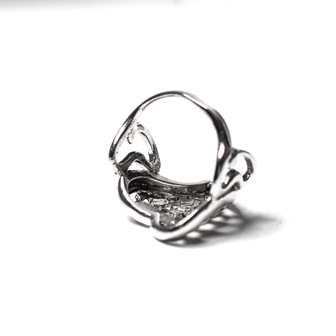 An elegant women's ring with a delicate and intricate open design. The ring is made of silver and features a unique openwork pattern with swirling and curved lines, giving it a sophisticated and artistic look and resembling a heart..