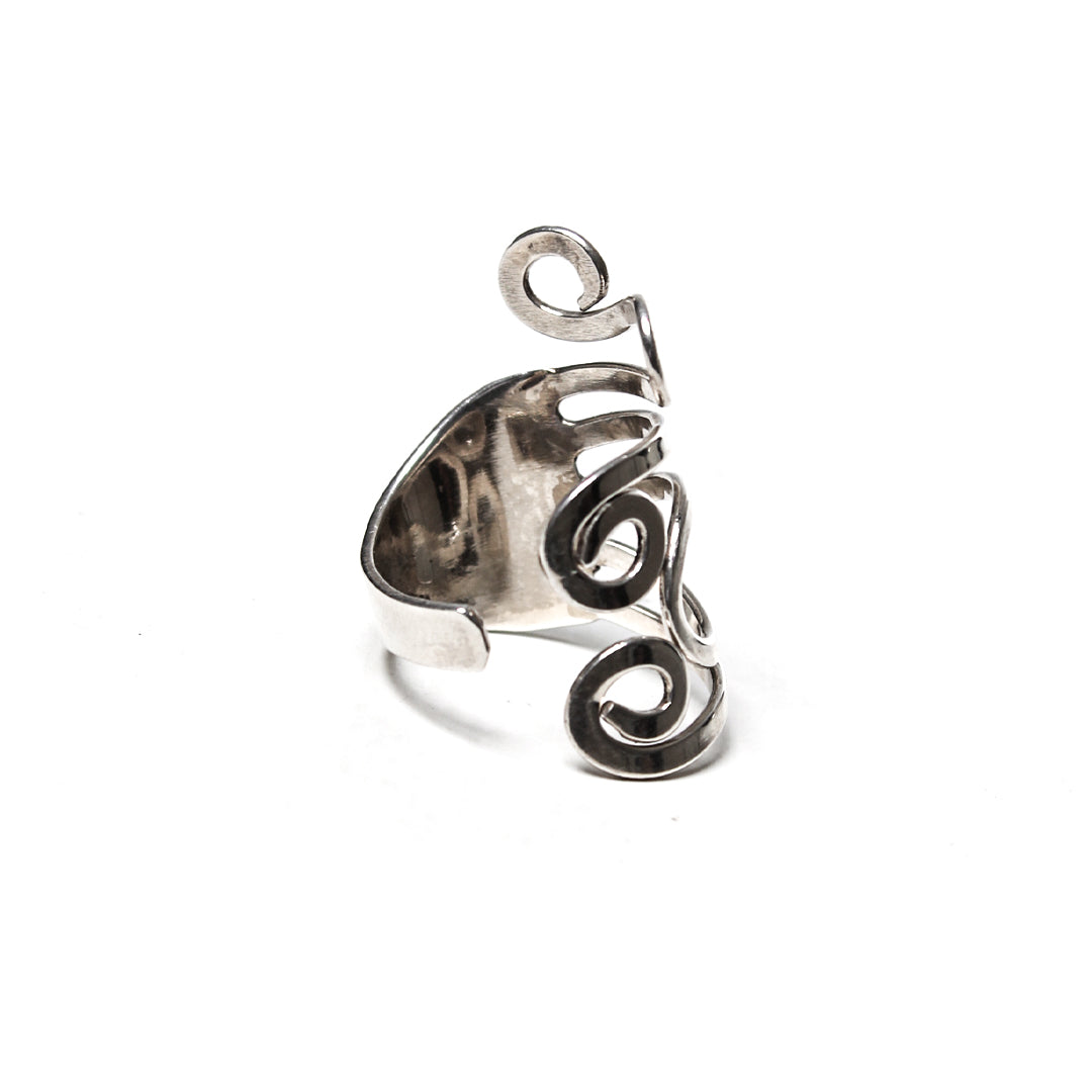 Intricate Open Design: The ring's open structure showcases delicate, swirling, and looping patterns that speak to refined craftsmanship. This design not only enhances its visual appeal but also serves as a subtle reminder of graceful movement and artistic inspiration.