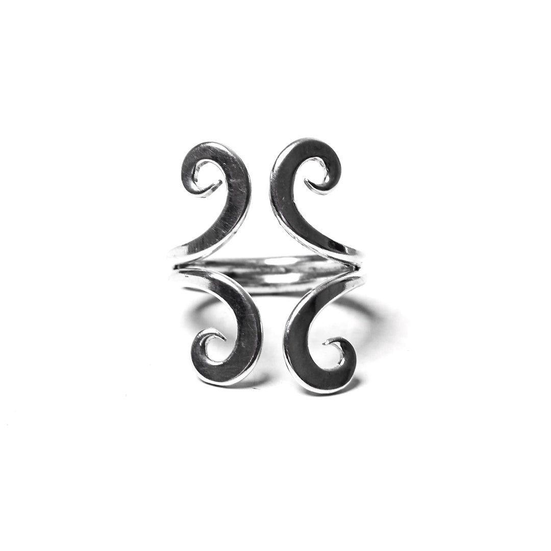 This is a delicate and elegant 925 sterling silver ring. The design features symmetrical, swirling patterns that create an intricate and stylish appearance. This type of ring is often appreciated for its delicate craftsmanship and timeless beauty, making it a perfect accessory for various occasions.