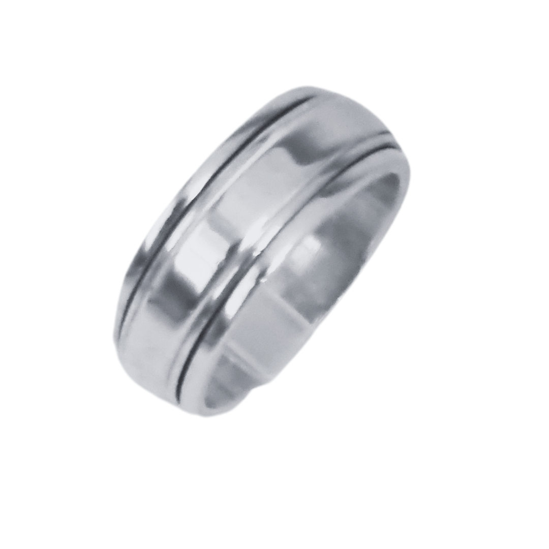 This is a 925 Sterling Silver band ring. The ring has a smooth, polished surface with a central groove running around its circumference, giving it a distinctive and elegant appearance. This type of ring is often referred to as a spinner ring, which can be interesting or relevant for those looking for a stylish and functional piece of jewellery. Excellent wedding ring.