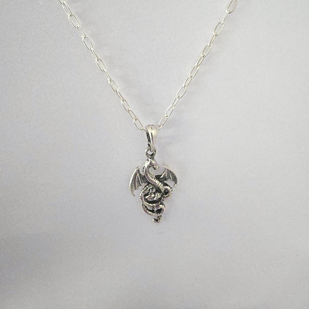 This pendant captures the spirit of myth with high-relief sculpting and careful finishing. The dragon's wings and curled tail create a compact, dynamic silhouette that reads clearly at its 2.5 cm height. The 45 cm chain sits comfortably at a classic collar length on most wearers and complements both casual and dressier looks. Handled with precision, the piece resists tarnish with proper care and keeps fine detail even after regular wear.