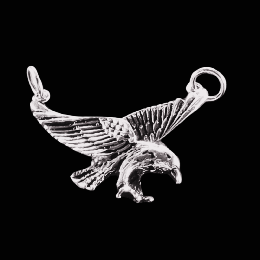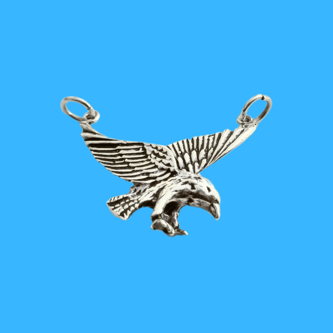 This 925 sterling silver pendant of a landing eagle is a dynamic and powerful piece of jewelry. With its wings fully spread and talons extended, the eagle captures a moment of precision and strength—symbolizing freedom, courage, and fierce determination. The detailed featherwork and lifelike posture give it a sense of motion, as if the eagle is descending from the sky with purpose.