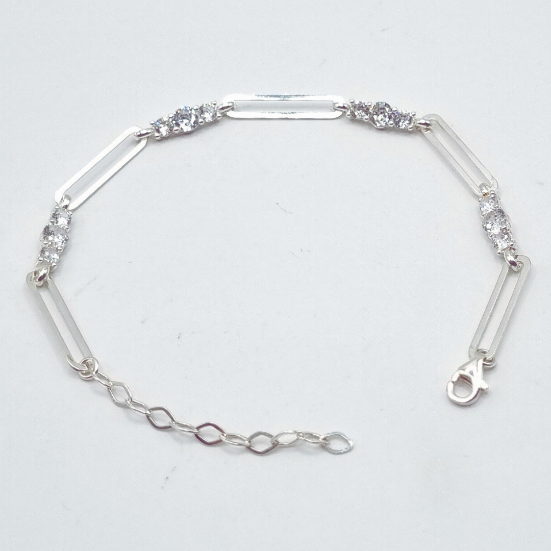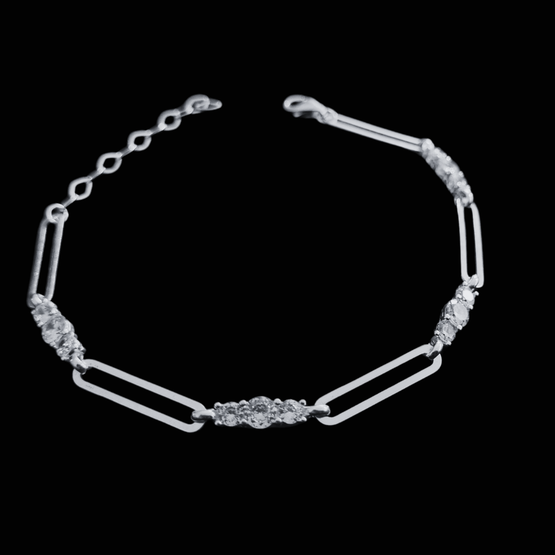 This fine 925 sterling silver bracelet is designed with elegance and delicacy, perfect for ladies who appreciate refined jewelry. The trio cubic zirconia (CZ) stones add a sparkling touch, beautifully set among rectangular silver links to create a sophisticated and graceful look. The craftsmanship ensures a polished finish, making it a timeless accessory.