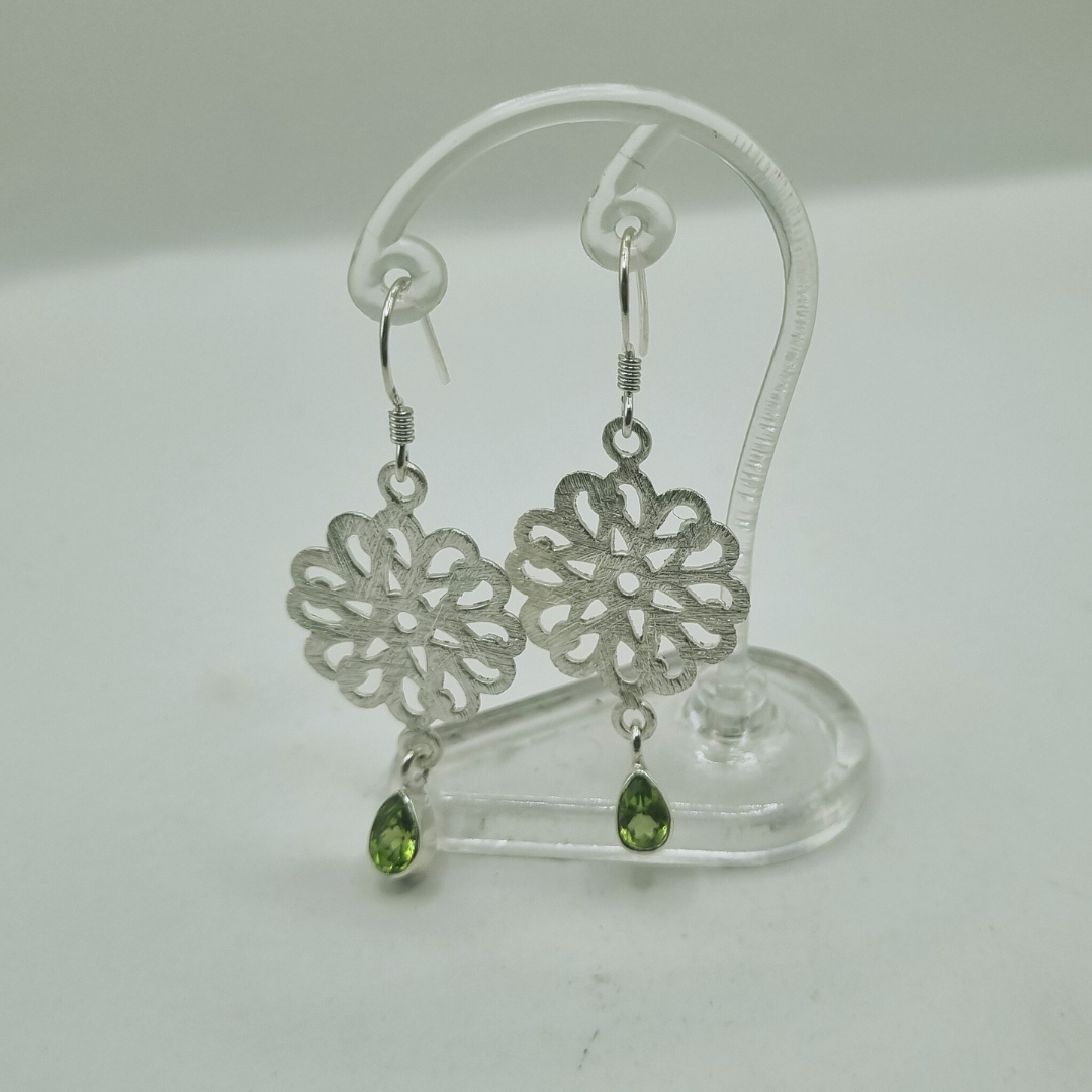 These 925 sterling silver earrings with a floral design and peridot stones are absolutely stunning! The teardrop-shaped peridot adds a vibrant green sparkle, beautifully complementing the intricate floral patterns on the silver frame. The hanging style allows for graceful movement, making them a sophisticated and elegant accessory.